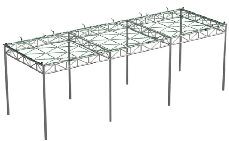 The hydraulic network is mounted on a metal support structure that coincides with the average height of the canopies of the most common trees. The misters are oriented towards the top of the structure, so that during misting, the system is self-protected from high temperatures by the misted water.