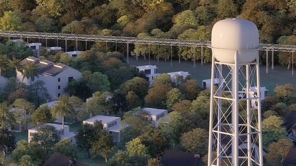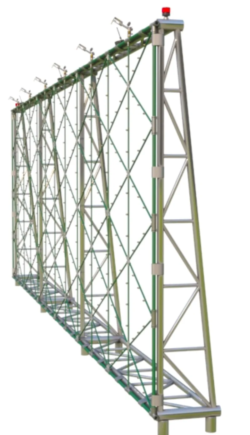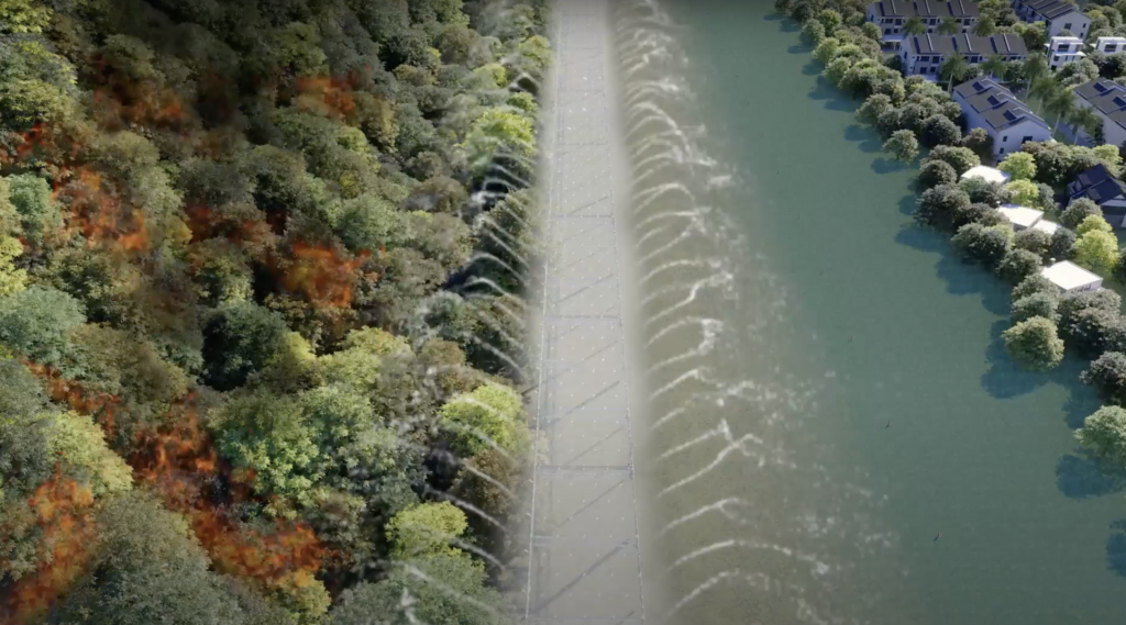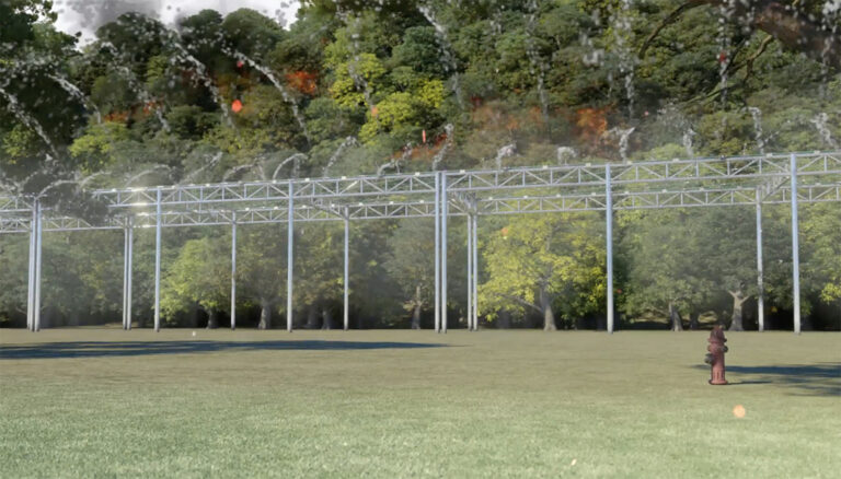 Provides a barrier against wildfires approaching populated, industrial, or agricultural areas. Our system creates a wall of misted water that acts as a firebreak and reduces ambient temperature, preventing the spread of fire by radiation. The hydraulic network also incorporates high-power sprinklers that provide humidification across its entire perimeter. It is a modular system that allows for the easy addition of new sections to protect large areas of land. The system is designed to surround the protected areas using a patented installation that includes automated activation with temperature sensors, a redundant protection system with a hydrant line, water connections, and independent power generators.